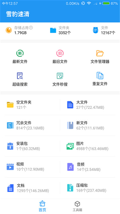雪豹速清最新版自动计算存储空间中所有文件的总大小、文件号和目录号,分析存储空间占用情况,把你认为重要的文件路径存在收纳盒里,下次可以直接找到。