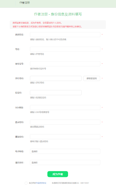 3、按照提示填写个人资料信息,即可成功注册成为作者。