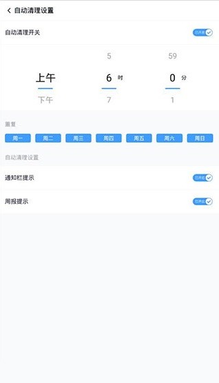 4、在设置页面中,你可以对自动清理功能进行开关操作,设置清理时间和清理周期,还可以选择开启或关闭相关提示功能。