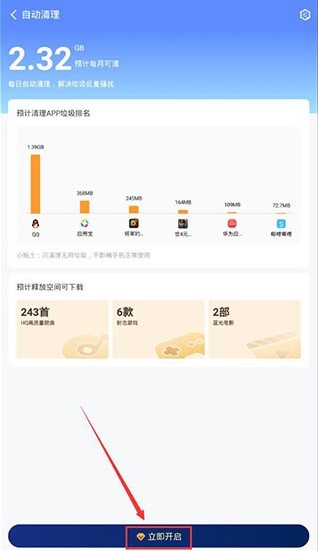 2、点击进入【自动清理】页面后,你可以查看预计清理的APP垃圾排行榜,页面最下方则有【立即开启】按钮。