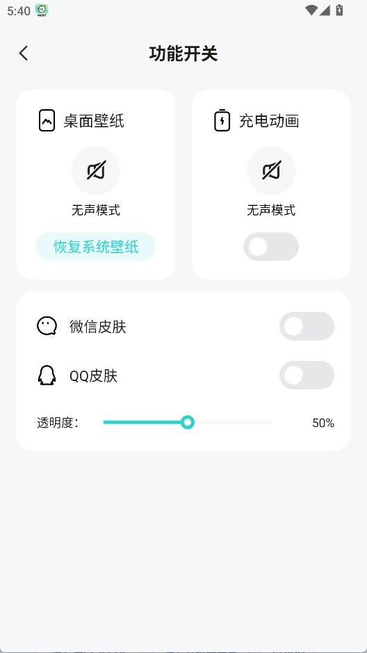 3、在设置界面的功能开关里开启微信皮肤后,就能够启用并设置透明皮肤效果。
