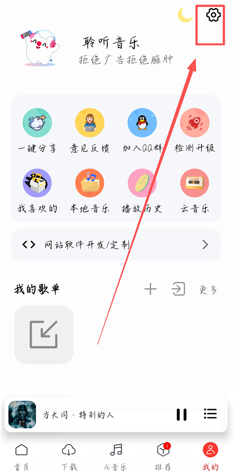 1、打开聆听音乐永久免费版App,进入【我的】界面,然后点击右上角的设置图标;