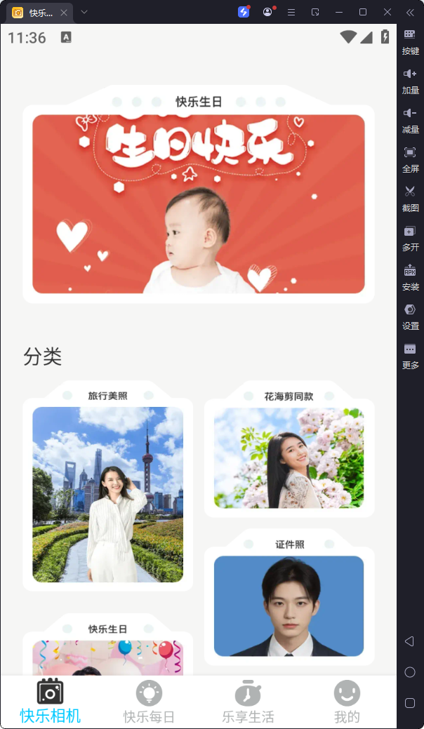 2、在功能分类中选择需要的照片类型,包括旅行纪念、证件拍摄或节日主题等模板。