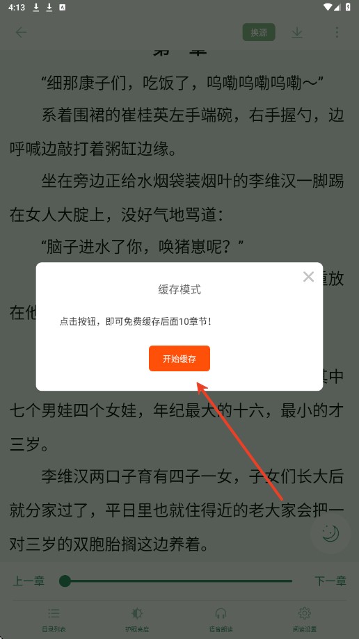2、点击“开始缓存”按钮,系统将自动开始下载小说,完成后你就可以离线阅读了。