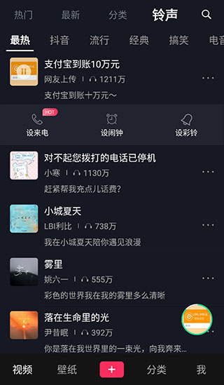 6、点击“铃声”选项,您可以选择多种类型的铃声,包括抖音、流行、经典、搞笑及电音等热门铃声。