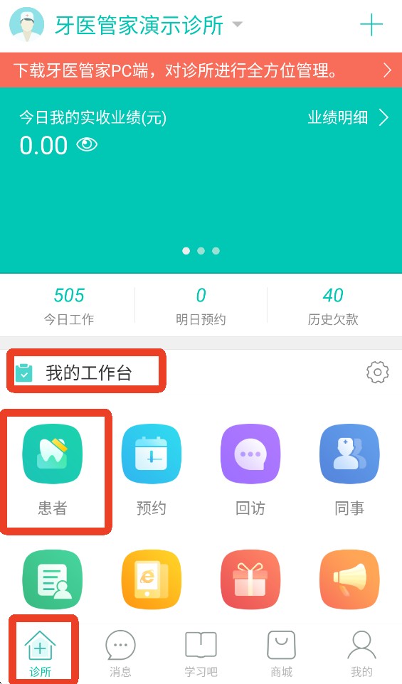 1、在牙医管家【诊所】页面的【我的工作台】栏目中,点击进入【患者】选项。