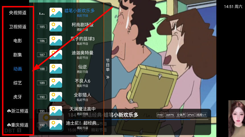 3、点击左侧按钮即可调出频道列表,方便选择。
