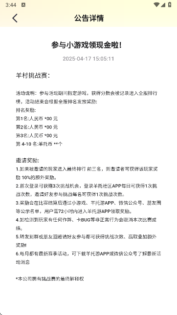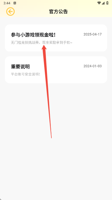 4、进入公告页面后,找到并点击查看“参与小游戏领现金奖励”活动说明。