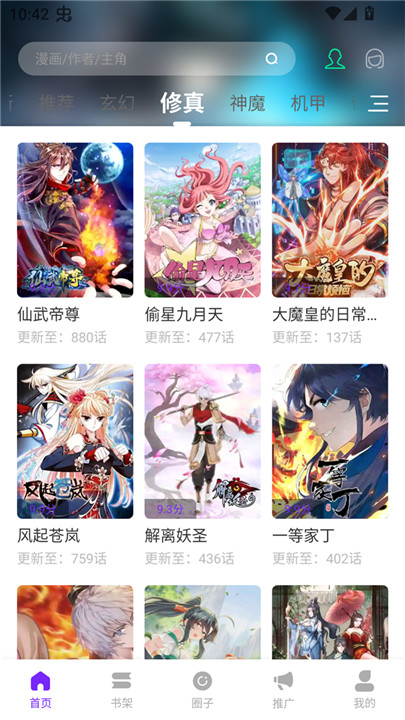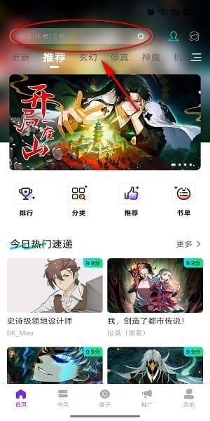 1、打开漫引力漫画免费版后,在“首页”最顶部的搜索框中输入漫画名称、作者或主角名字都可以进行搜索;