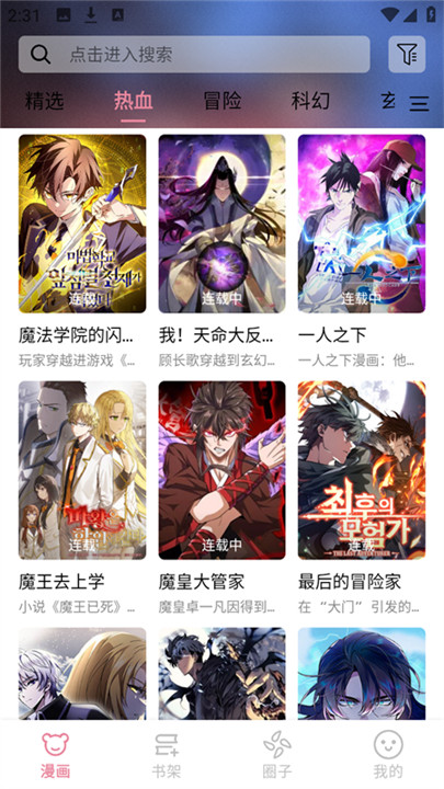 4、拥有庞大的漫画资源库,拥有国内外经典作品和热门新作,涵盖热血、爱情、悬疑、玄幻等多个类型。