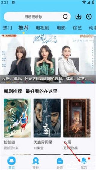 1、进入星辰影视完整版后,首页的“新剧推荐”板块里有着当前最受欢迎的剧集,点击右下角的【我的】进入个人主页;