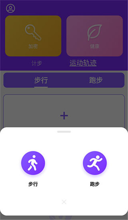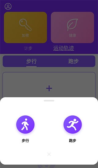 5、你还可以在上方切换到“运动轨迹”界面,然后点击右侧的“+”号,选择想要进行的运动类型,比如步行或跑步。