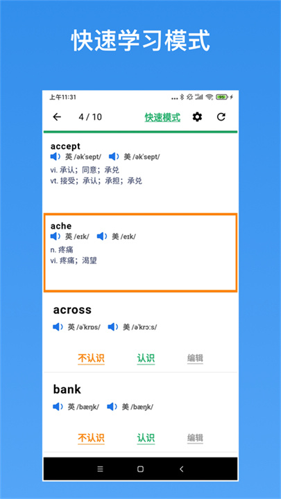 4、学习面板整合了语音、例句、词义辨析等信息,以卡片切换的形式呈现,使记忆过程生动直观。