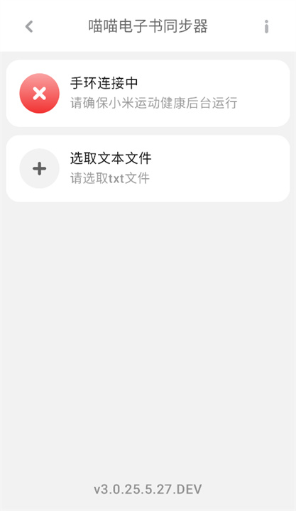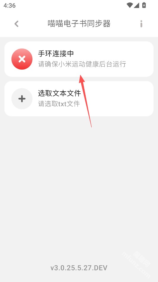 1、打开喵喵电子书同步器,然后点击主页上方的连接按钮,将你的小米手环与应用进行配对。