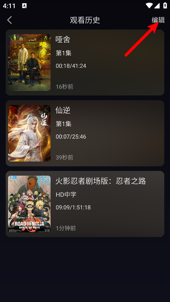 2、进入历史记录页面后,点击右上方的"编辑"按钮。