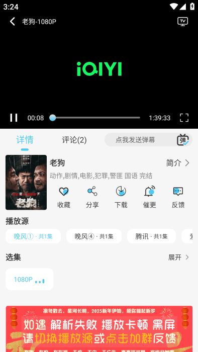 3、在播放界面,可以查看影片的详细简介,还能直接下载影片,甚至支持投屏播放。如果播放出现卡顿,还可以切换播放源,非常实用。