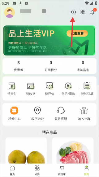 1、进入品上生活【我的】页面后,点击右上角的设置图标,打开设置界面。