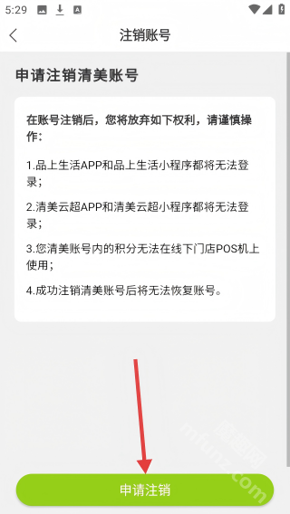 4、仔细阅读注销说明后,点击【申请注销】按钮,即可完成账号注销流程。