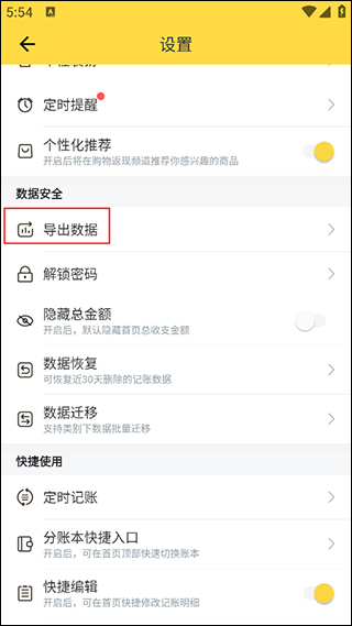 2、在设置页面中,向下滑动找到“数据安全”列表下的“导出数据”选项,点击进入该功能页面;