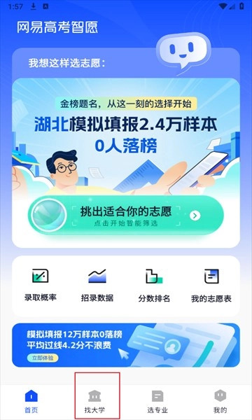 1、打开网易高考智愿最新版软件后,选择进入“找大学”功能。