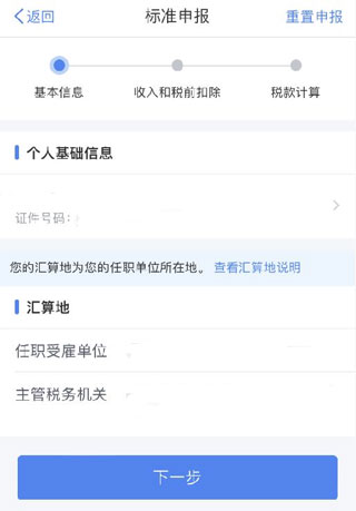 5、进入信息确认页面,核对个人身份信息、所属单位、主管税务机关及汇算地是否准确,确认无误后点击【下一步】。
