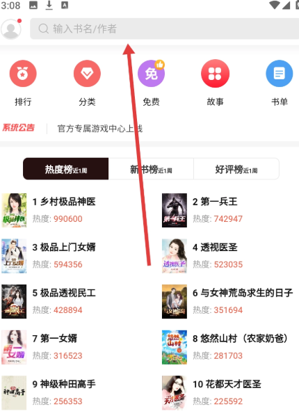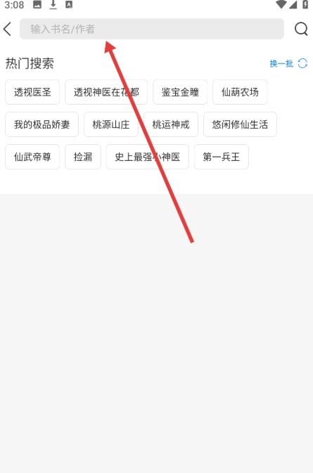 2、书城页点击【搜索栏】,准备进入搜书页面。