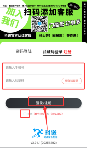 2、在抖送骑士版众包兼职该界面中选择使用手机号登录,进入输入验证码的登录页面。
