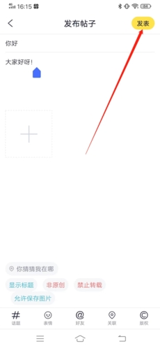2、在编辑页面中填写帖子标题以及相关内容,完成后点击右上角的“发表”;
