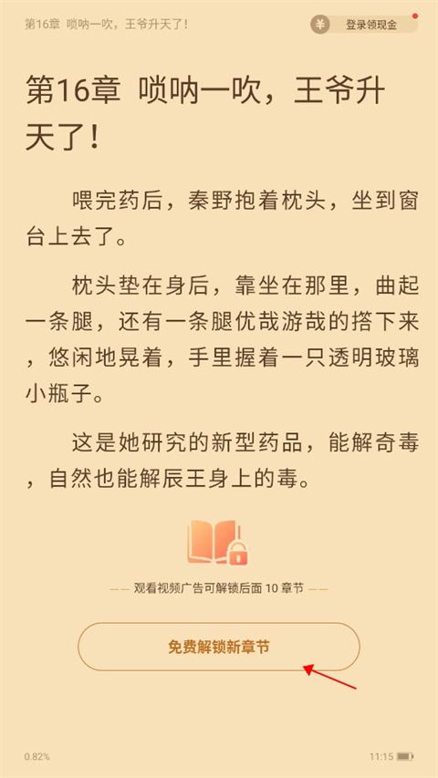 1、在阅读疯读小说极速版免费时,如果遇到后续内容需要解锁的情况,点击“免费解锁新章节”;
