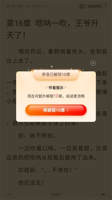 2、观看完整广告后即可解锁10章内容,如需解锁更多章节,可以继续观看广告或选择开通会员服务。