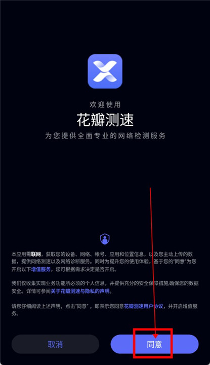 1、接受协议:仔细阅读花瓣测速最新版本使用协议后,点击“同意”即可进入主界面。