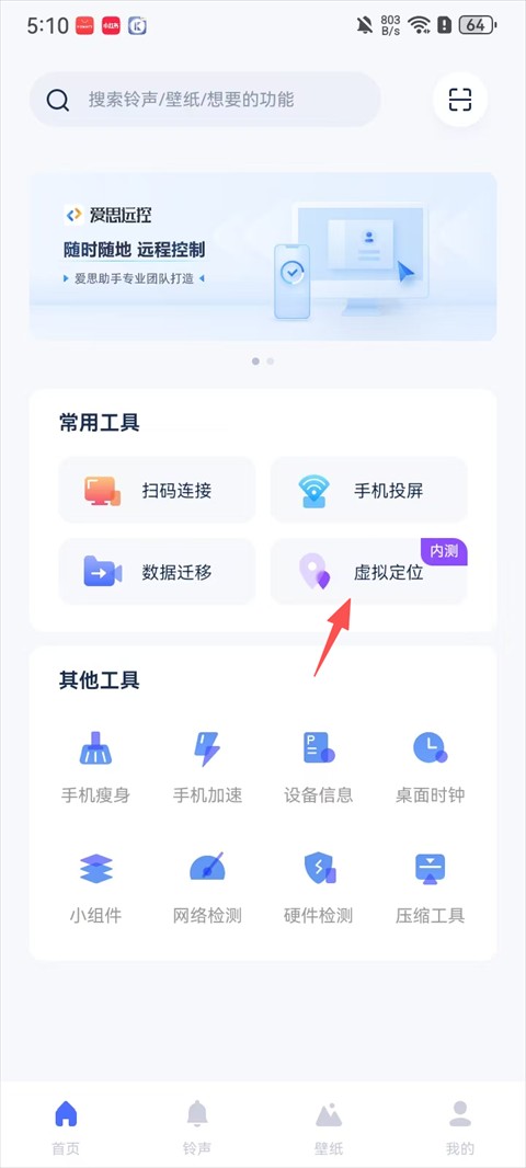 1、打开爱思助手极速版,点击首页【虚拟定位】功能;