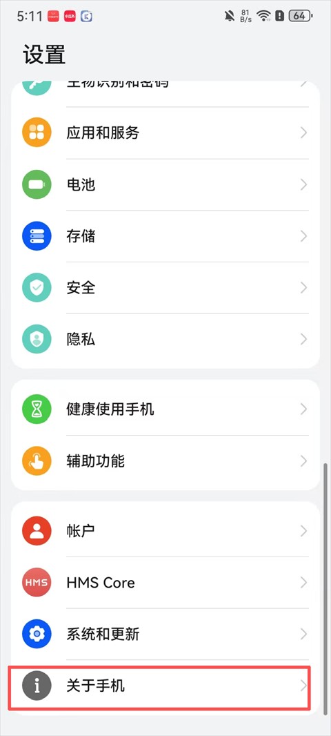4、以华为手机为例,找到并点击【关于手机】;