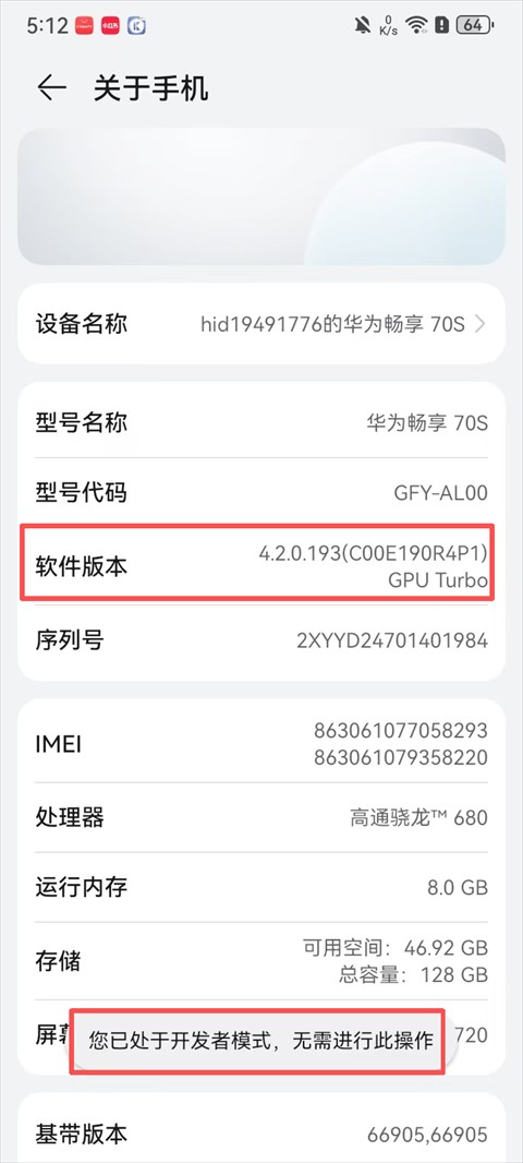 5、连续几次点击【软件版本】或者有其他手机有【版本信息】直到开启开发者模式;