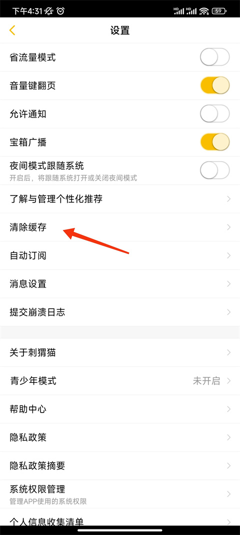 3、进入设置界面后,我们会点击箭头指示的清除缓存选项;