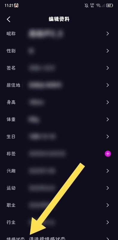 3、进入编辑页面后,会显示多项个人信息内容,例如昵称、性别、所在地等,在其中找到“情感状态”这一项并点击进入。
