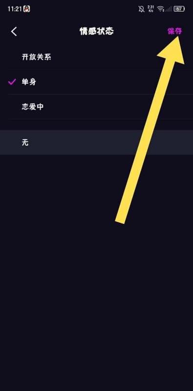 4、在情感状态设置界面中,会提供多个可选项,比如“单身”“恋爱中”“已婚”“暗恋”等,根据自己的实际情况进行选择,选好后点击页面底部的“保存”按钮,即可完成情感状态的修改。