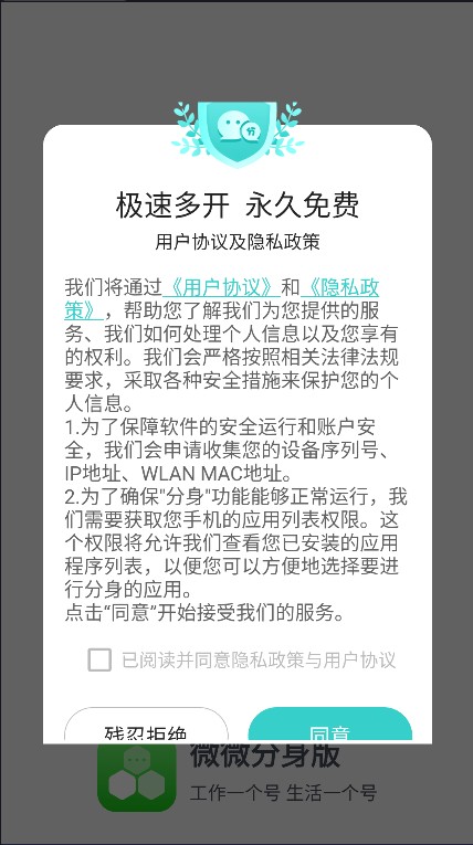 1、打开麻吉分身应用程序后,先勾选同意隐私政策以及用户协议,然后进入软件。
