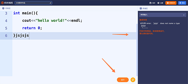 5、接着进入代码编辑界面,自己进行编程。如果编写有误,点击运行后会显示编译失败,并指出错误的具体行号,按提示修改即可。