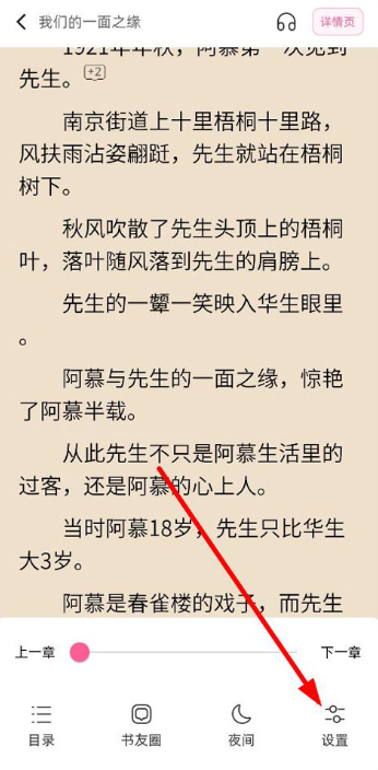 2、进入阅读界面后,轻触屏幕中央即可调出功能菜单,然后点击右下角的“设置”图标。