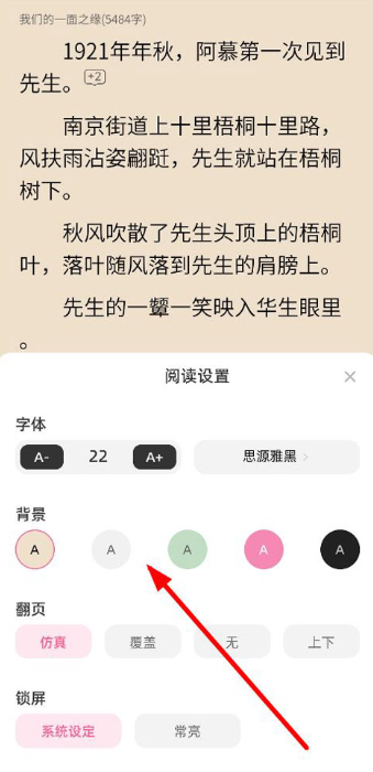 3、在弹出的阅读设置界面中,可以根据个人偏好调整字体大小、字体类型、背景颜色、翻页方式以及屏幕常亮等功能选项。