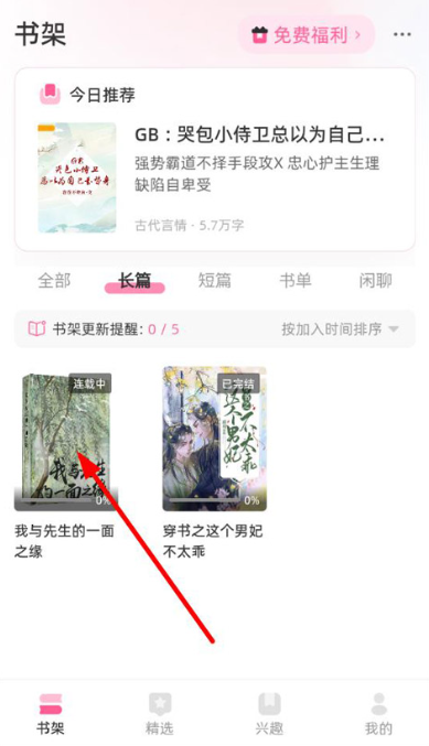 1、打开布咕阅读免费阅读入口App并登录账号,进入主界面后,可在书架查看已收藏的书籍以及系统推荐内容,点击任意书籍即可进入阅读。