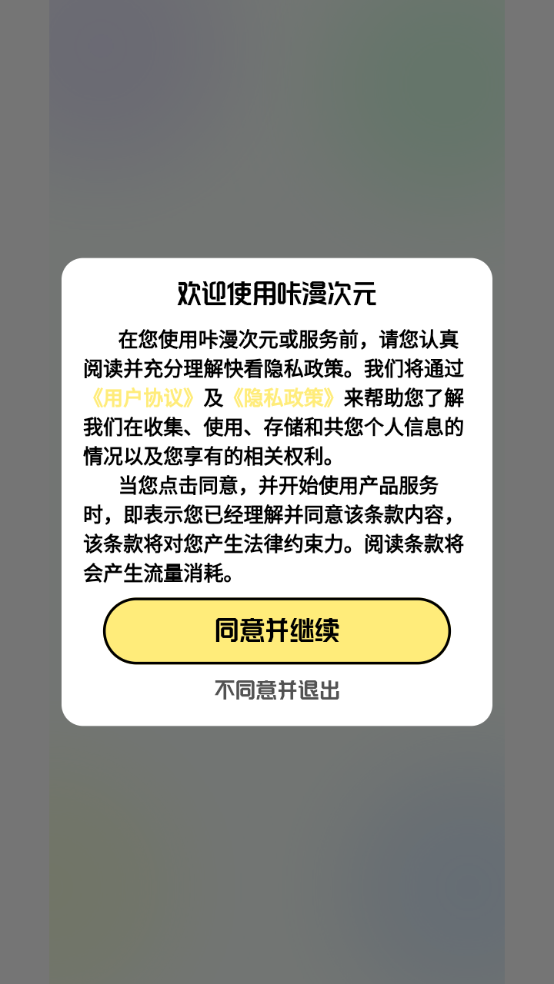 1、用户先打开在本站下载安装好的咔漫次元app,然后同意隐私政策与用户协议。