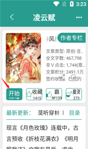2、进入小说页面后,会跳转到作者专栏,点击“开始阅读”进入正文。