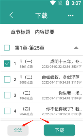 5、勾选需要保存的章节,可以单独选择或直接全选,然后点击“开始下载”,等进度条完成即可。