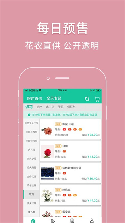 2、支持每日限时竞价活动,使采购商以更优惠的价格获得高品质的花卉材料。