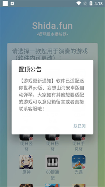 Shida钢琴助手带来了十分舒适好用的音乐演奏服务,涵盖了海量的音乐工具,让我们所有用户都可以轻松方便的演奏各种好听的歌曲,还支持各种热门游戏,例如原神、光遇等等游戏内置的演奏玩法都可以自动的进行演奏,包含的音乐资源也是非常的丰富,而且很多的琴谱资源都是完整免费的哦,而且不拘于设备的限制,就算是小白也可以轻松简单的自动弹奏出各种好听的曲谱,喜欢的小伙伴欢迎点击下载下来吧。