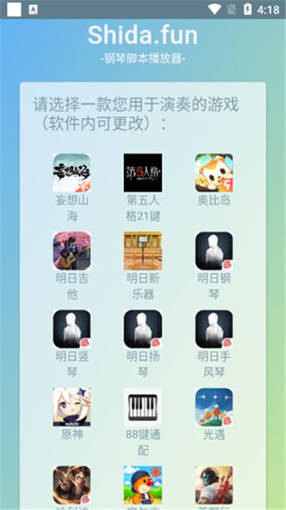 初次打开Shida钢琴助手软件时会直接进入选择游戏的界面,在这里挑选你想用来演奏的游戏乐器就可以了(后续随时可以在软件内更换)。