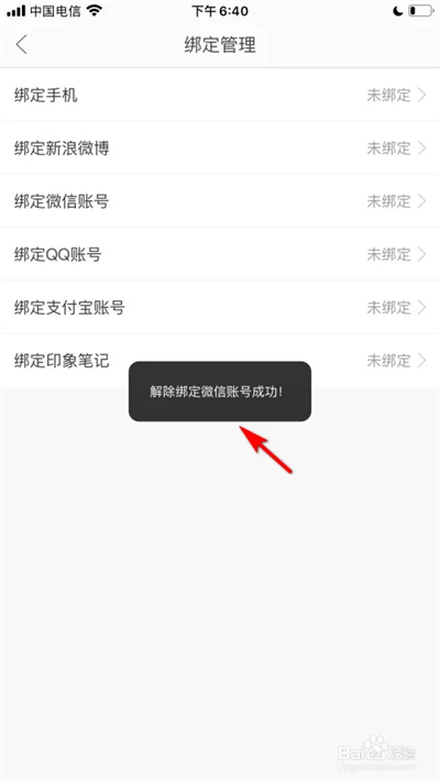 6、系统将提示解除微信帐户绑定成功。